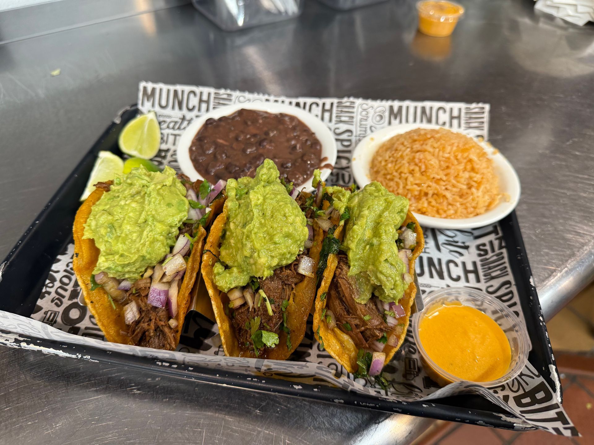 Served with cilantro, onion, lime, and your choice of hot or mild sauce on the side.